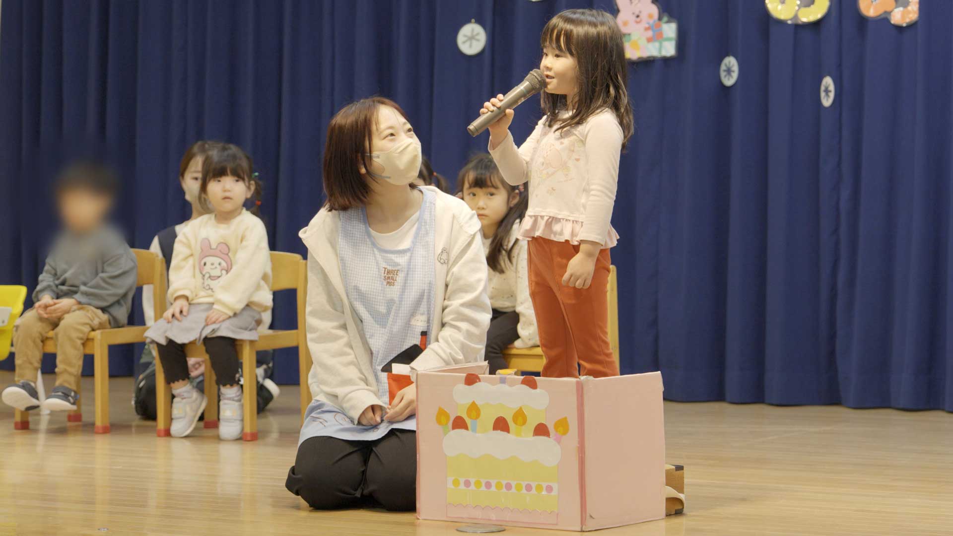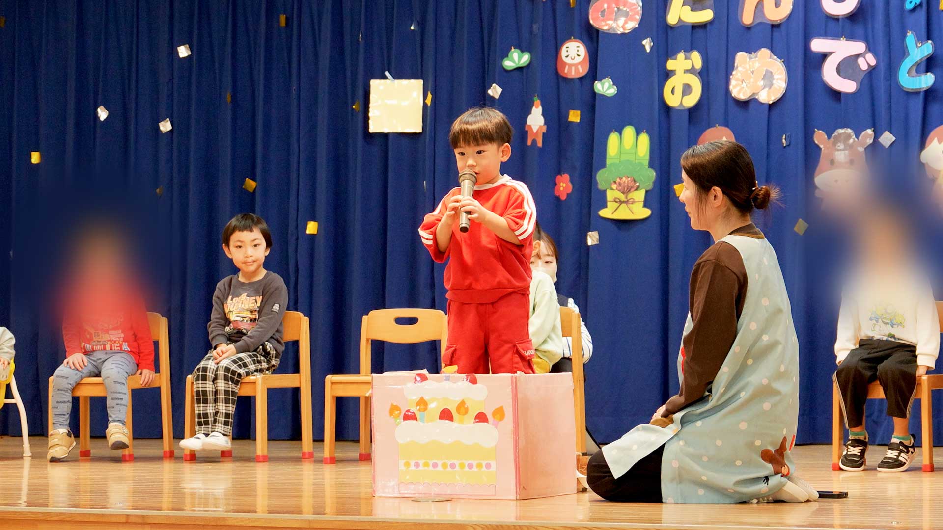 お誕生日を迎えた子どもたちは、みんなの前で少し照れながらも、先生からのインタビューに元気よく答えてくれました!