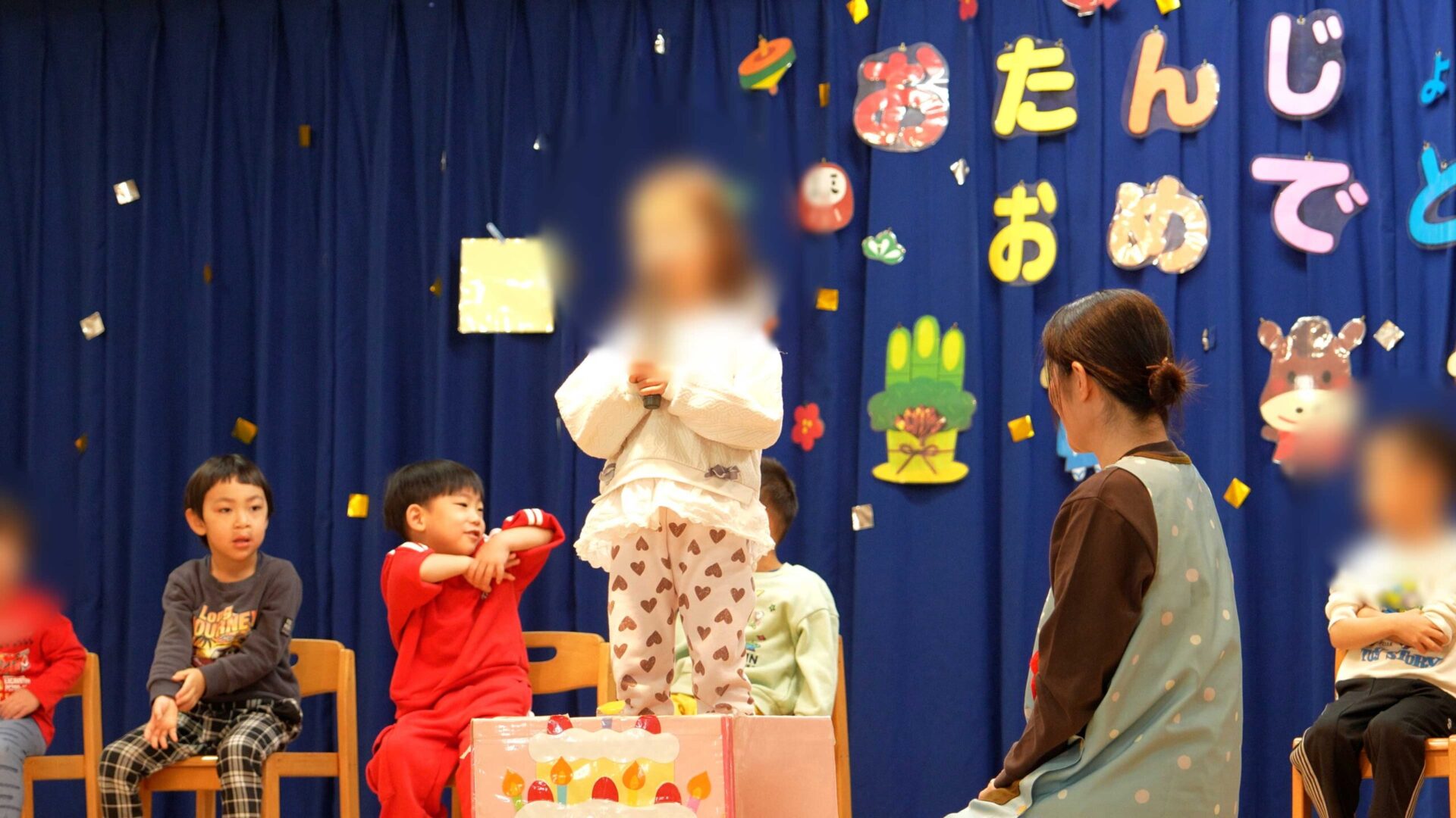 寒さが感じられる季節の中、おともだちや先生にお祝いされながら、12月生まれのおともだちはうれしそうな表情を見せてくれました。